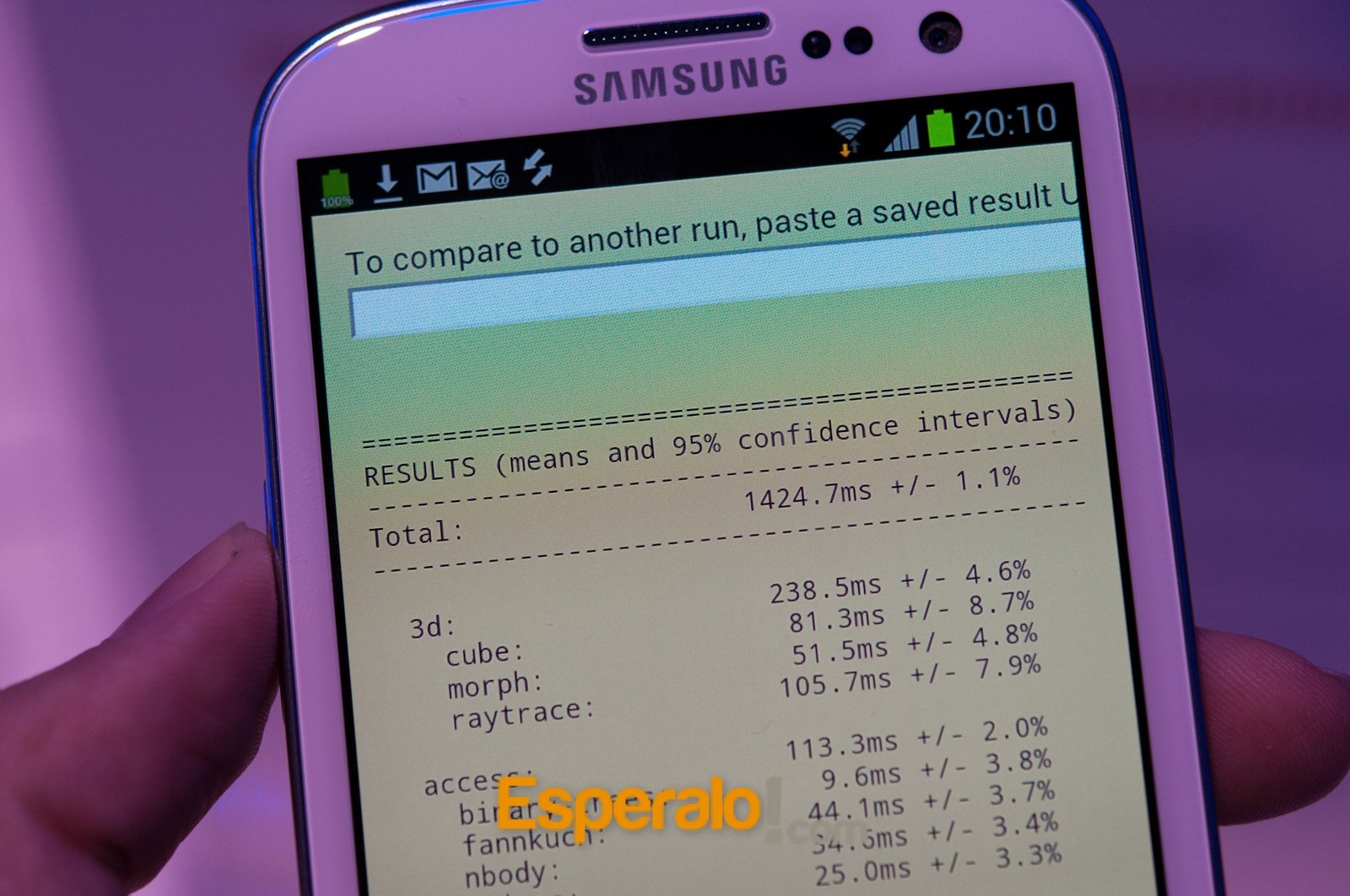 El Galaxy S III tiene una increíblemente rápida GPU (Mali-400/MP4), y un navegador que se ejecuta JavaScript extremadamente rápido. El rendimiento es habilitada por el “Samsung’s 32nm high-k + metal gate LP process”. Cuenta con una batería 7.77Wh que con el bajo consumo del procesador da un alto rendimiento, especialmente comparado con el Galaxy S II